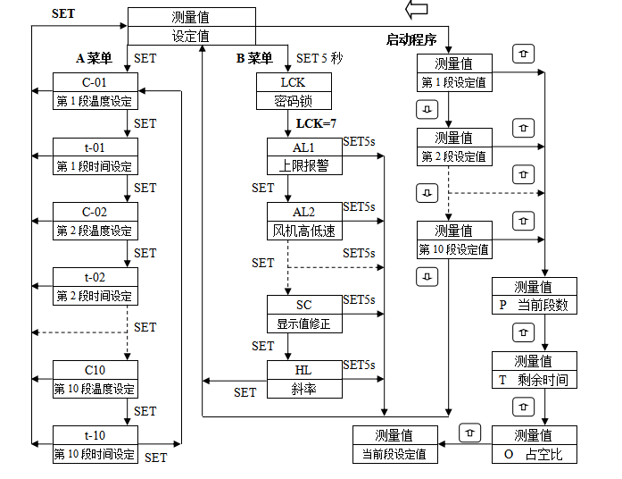 2. 按程序設定說明的操作步驟,設定所需工作溫度,即測量值顯示“C-01”時,按需設定溫度,測量值顯示“t-01”時,將時間設定為**大值“999”,將“t-02”**“t-10”設為“0”,再恢復到正常顯示狀態;
