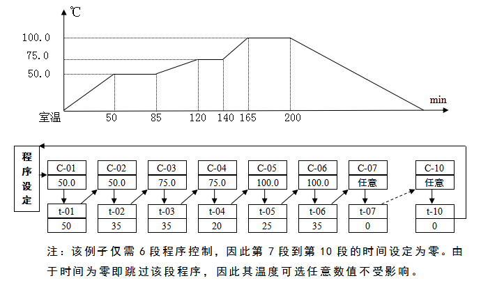 注:該例子僅需6段程序控制,因此第7段到第10段的時間設定為零。由于時間為零即跳過該段程序,因此其溫度可選任意數值不受影響。