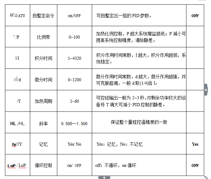 當溫度控制效果不夠理想時,可以通過手動設置改變PID參數。P為比例帶(加熱側),如過沖大可加大比例帶。如希望升溫時間快些可減小比例帶。一般來說,系統的保溫特性越好,P取值越小,如保溫特性越差,P應取越大,I為積分時間,如溫度波動較大,應加長積分時間,反之可減小積分時間。一般來說系統滯后現象嚴重,積分時間越長。D為微分時間,一般取(1/5—1/4)I。