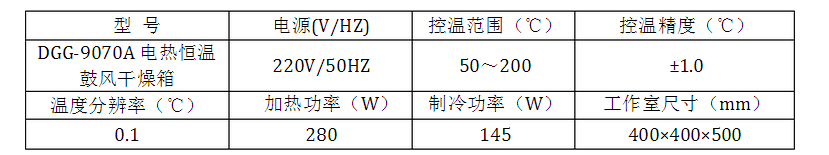 該設(shè)備采用高精度微機控溫儀,具有響應(yīng)快、超調(diào)小、精度高的特點,使用輕觸按鍵設(shè)定參數(shù),加熱恒溫系統(tǒng)由裝有離心式葉輪的德G優(yōu)質(zhì)風(fēng)機、電加熱器、合適的風(fēng)道結(jié)構(gòu)和溫度控制器組成。當(dāng)接通干燥箱電源時, 風(fēng)機即同時運轉(zhuǎn),直接將位于箱內(nèi)底部的電加熱器產(chǎn)生的熱量通過風(fēng)道向上排出,經(jīng)過工作室內(nèi)干燥物品再吸入風(fēng)機,以此不斷循環(huán),從而使工作室內(nèi)溫度達(dá)到均勻。 4.2 設(shè)備主要參數(shù)