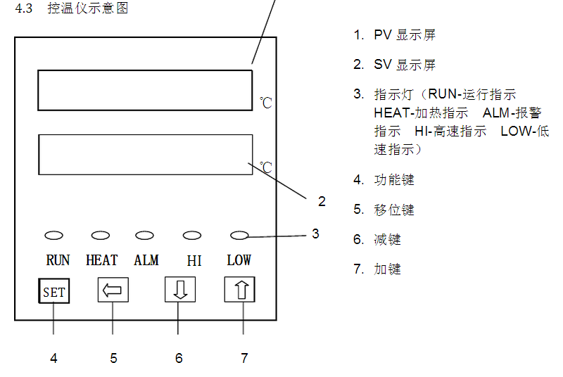 4.5.2 設(shè)定定時時間:定時功能為倒計時運行(**高可設(shè)定到9999小時)。 定時設(shè)定:按SET鍵兩次,此時PV顯示屏顯示ST,SV顯示屏顯示0,并閃爍;當(dāng) PV窗顯示T 1時,進入定時設(shè)定,出廠時S V為0000 ,表示定時器不工作,如需定時1小時,用移位鍵配合加鍵,把S V窗設(shè)定為0060,定時2h,設(shè)定為0120,以次類推。設(shè)定完畢后,儀表進入定時運行狀態(tài),此時運行指示燈閃爍;按SET鍵儀表進入定時運行狀態(tài),此時運行指示燈閃爍。當(dāng)P V > S V 時,即箱內(nèi)溫度高于設(shè)定溫度時,定時開始工作,采用倒計時,同時S V 數(shù)碼管末位上的一位小數(shù)點閃爍。