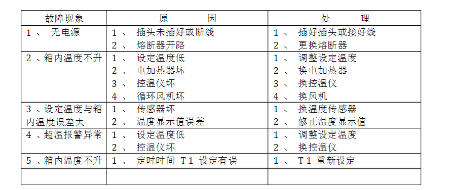 4.7.2 如果運行溫度過高,務(wù)必等到設(shè)備冷卻以后再取出物品。 4.7.3 箱內(nèi)物品放置切勿過擠,須流出空間,以利熱空氣循環(huán)。 4.8 維護保養(yǎng)