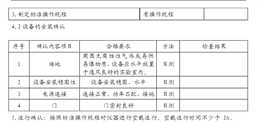 2.驗證目的:通過對設備資料檢查,運行、性能的確認,確保儀器的相關資料的齊全、完整,各項性能穩定,從而保證檢驗的準確、可靠。 3.驗證依據:???? 4.設備的預確認 4.1操作規程等資料確認