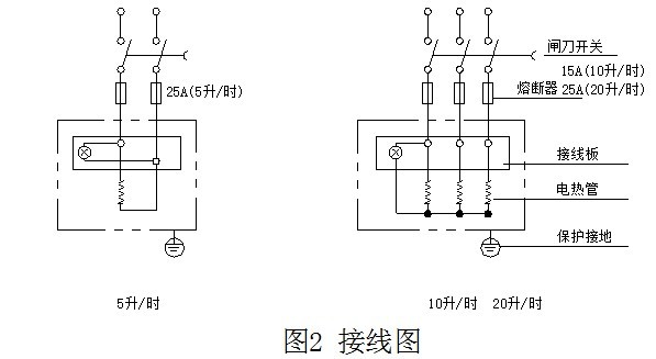 2.電源:用戶根據(jù)產(chǎn)品銘牌所示參數(shù),按接線圖接線,電源插座應有可靠接地,并應配有熔斷器(用戶電路中必須安裝),保證使用安全,(5升、20升:2**;10升:1**)見(圖2)。