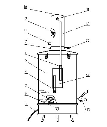本儀器主要由冷凝器、蒸發(fā)鍋、電熱管三部分組成。主體材料均采用不銹鋼薄板與不銹鋼無縫管制成,外形美觀。電加熱管采用浸入式電熱管熱效率高。主要結(jié)構如下圖: